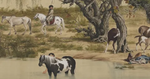 此《百骏图》卷由清代郎世宁绘制。画卷描绘草原上百匹骏马的放牧景象,或卧或立、或嬉戏觅食,聚散自然,气息闲适。画中融汇西洋透视与明暗法,运用前实后虚、前大后小之法,营造空旷深远的空间,人物、草木、山水皆写实精致。此卷绘制于清雍正六年,现藏台北故宫博物院。